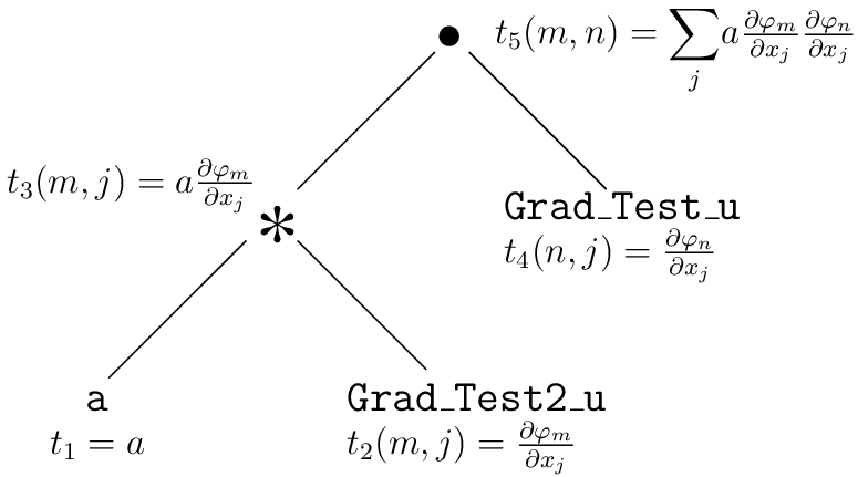 For example, the assembly tree for the assembly string “a*Grad_Test2_u.Grad_Test_u” for the stiffness matrix of a Laplacian problem can be represented as follows with its assembly tensors at each node: